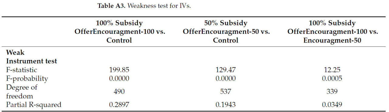 Нарушение условия ограничения исключения приводит к смещению и несогласованности оценок IV [58]. Хотя мы не можем провести прямой эмпирический тест на ограничение исключения, мы можем предоставить точную интуицию [59]. Наши случайные предложения субсидий на мешки PICS только предоставляют мелким фермерам доступ к мешкам, и только после использования мешков PICS фермеры могут хранить кукурузу, что может снизить заражение насекомыми-вредителями, уменьшая потери при хранении. Следовательно, наши поощрения (IV) не оказывают прямого влияния на результаты, если мешки PICS не используются. Из-за нашей экспериментальной установки мы запустили отдельные регрессионные модели для предложения 100% субсидии и 50% субсидии. Равное количество экзогенных инструментов и эндогенных переменных могло уменьшить смещение почти до нуля [60]. Поэтому наши IV удовлетворяют условию ограничения исключения.
