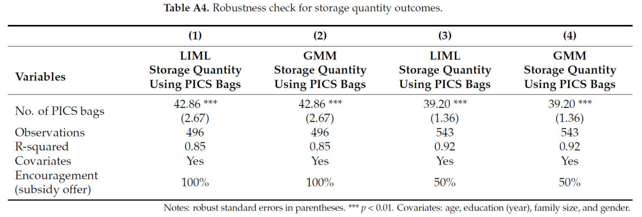 Таблица 4 представляет локальные средние эффекты лечения (LATEs) на результаты количества хранимой продукции через два поощрения: предложения 100% и 50% субсидии. Колонки (1) и (2) таблицы показывают LATEs без ковариат и с ковариатами соответственно для фермеров, которых поощряли 100% субсидией. Аналогично, колонки (3) и (4) таблицы показывают LATEs без ковариат и с ковариатами соответственно для фермеров, которых поощряли предложением 50% субсидии. Результаты указывают, что дополнительная единица внедренного мешка PICS увеличивает хранение кукурузы на 42,84 и 42,86 кг без ковариат и с ковариатами соответственно для тех, кого поощряли 100% субсидией. Аналогично, это увеличивает хранение кукурузы на 39,20 кг без ковариат и с ковариатами соответственно для фермеров, поощренных предложением 50% субсидии. Результаты показывают, что существует положительный и значимый эффект (p-значение <0,001) на количество хранимой продукции из-за внедрения мешков PICS, несмотря на контрольные переменные (Таблица 4).