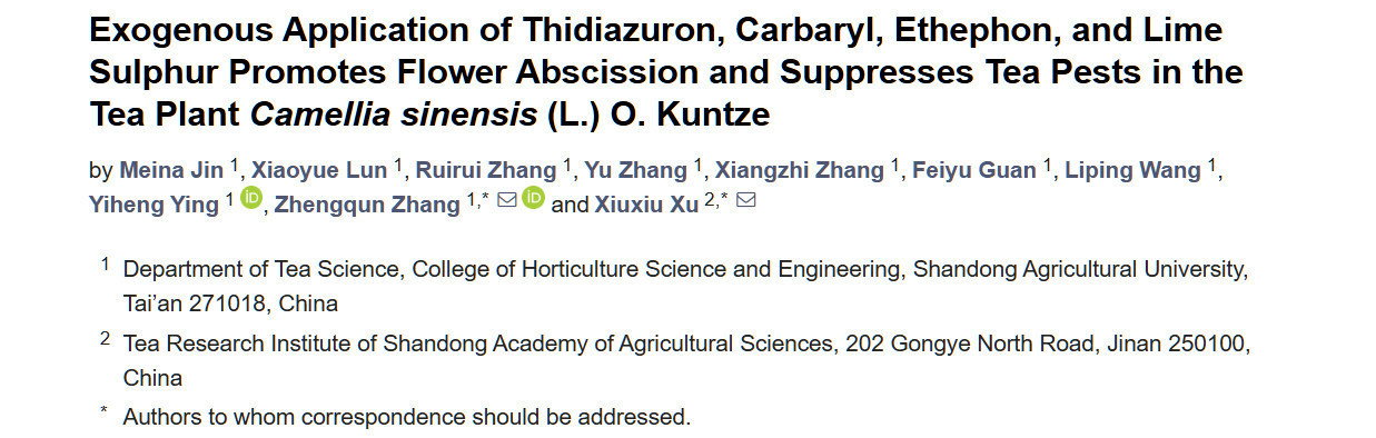 Jin M, Lun X, Zhang R, Zhang Y, Zhang X, Guan F, Wang L, Ying Y, Zhang Z, Xu X. Exogenous Application of Thidiazuron, Carbaryl, Ethephon, and Lime Sulphur Promotes Flower Abscission and Suppresses Tea Pests in the Tea Plant Camellia sinensis (L.) O. Kuntze. Agriculture. 2025; 15(2):150. https://doi.org/10.3390/agriculture15020150