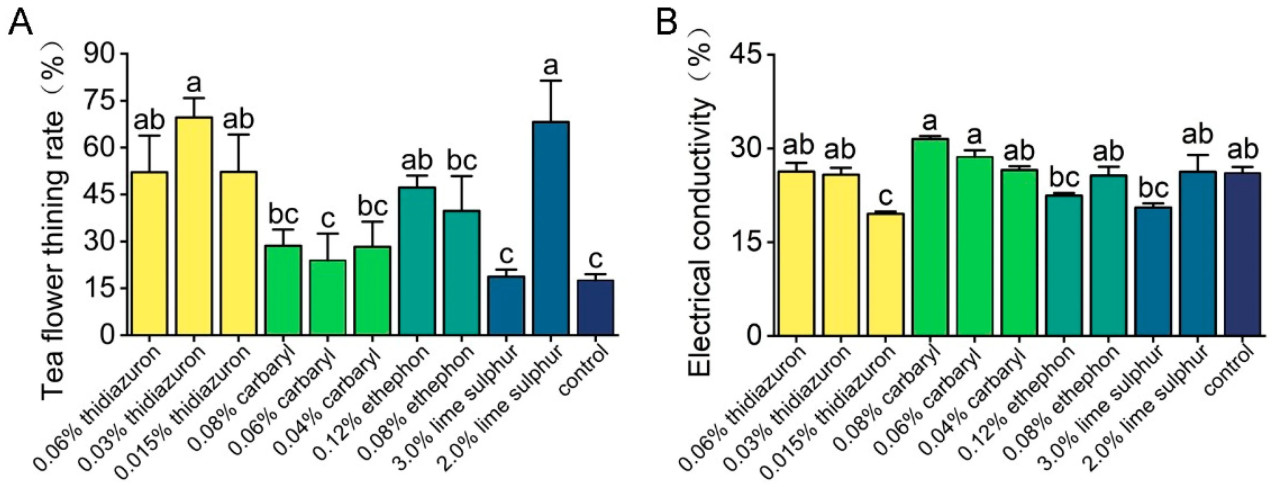 Рисунок 1. Влияние тидиазурона, карбарила, этрела и известковой серы на количество цветочных почек и цветков чая на чайных плантациях (A) и на электропроводность чайных листьев (B). Разные буквы указывают на значительные различия между различными обработками (тест Тьюки HSD, p < 0,05). Данные представляют собой средние значения трех независимых делянок ± стандартная ошибка.
