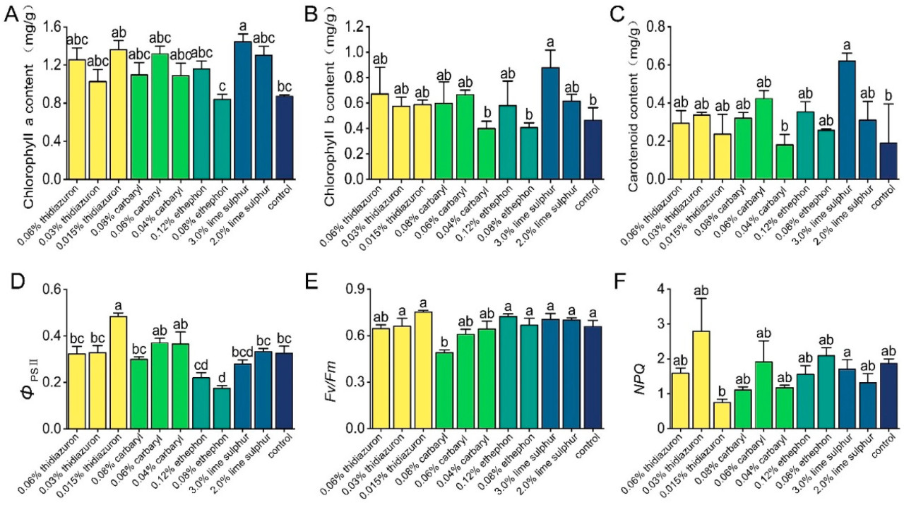 Уровни хлорофилла a, хлорофилла b и каротиноидов в чайных листьях, обработанных 3,0% известковой серой, были значительно выше по сравнению с необработанными контрольными чайными листьями (хлорофилл a: F = 3,992, p = 0,003; хлорофилл b: F = 2,844, p = 0,002; каротиноид: F = 3,992, p = 0,003). Не было обнаружено значительных различий в содержании фотосинтетических пигментов среди других различных химических обработок. Чайные листья, обработанные 0,015% тидиазуроном, показали значительно более высокий ΦPSII, чем в необработанных контрольных чайных листьях. 0,08% этрел значительно снизил ΦPSII в листьях чайного растения (F = 10,741, p < 0,001). Также 0,08% карбарил значительно снизил Fv/Fm в листьях чайного растения (F = 4,197, p < 0,001). Не наблюдалось значительных различий в ΦPSII, Fv/Fm или NPQ среди других различных химических обработок (Рисунок 2).