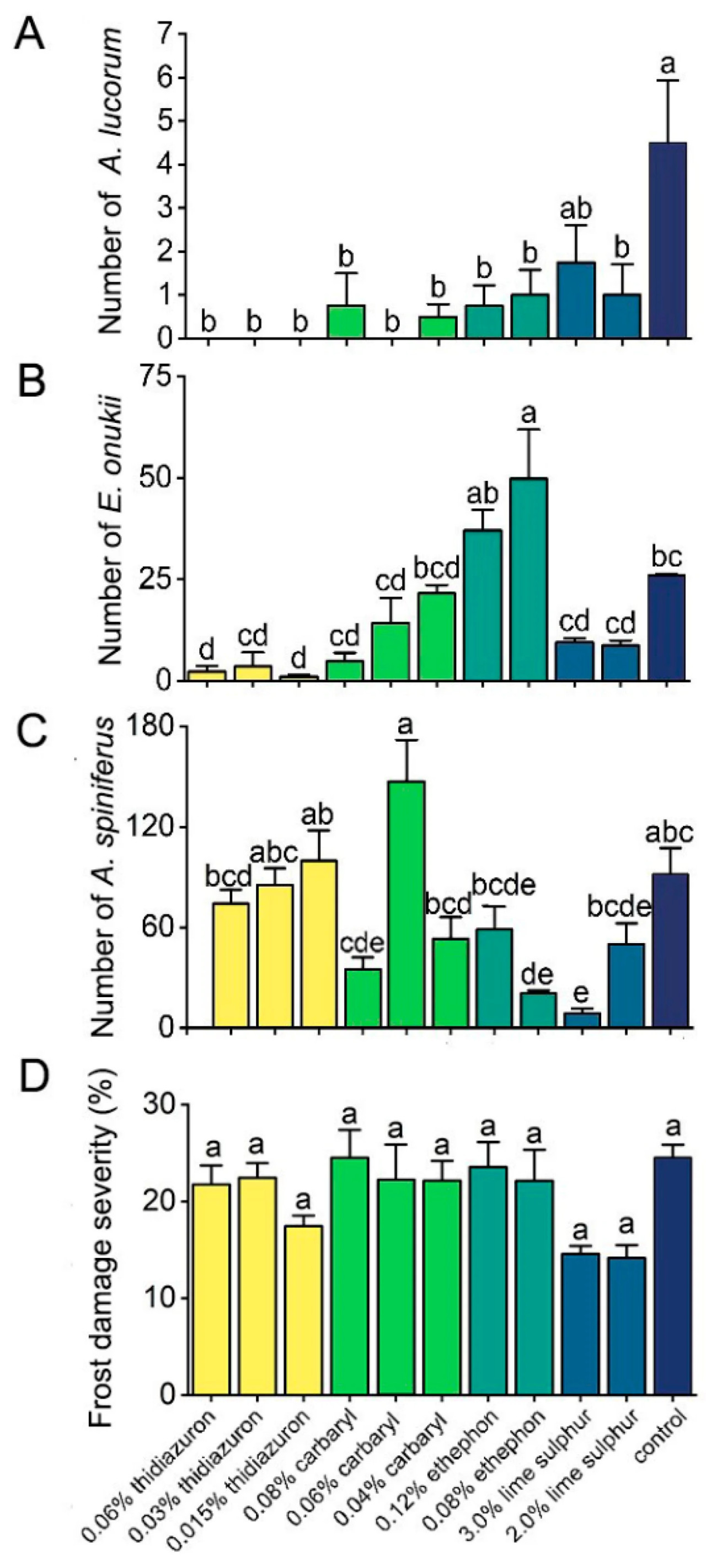 Рисунок 4. Влияние тидиазурона, карбарила, этрела и известковой серы на количество A. lucorum (A), E. onukii (B) и A. spiniferus (C) на ловушках рядом с чайным растением. Ловушки устанавливались сразу после опрыскивания, а измерения проводились через 10 дней после обработки. Также измерялась степень повреждения морозом (D) на чайном растении. Разные буквы указывают на значительные различия между различными обработками (тест Тьюки HSD, p < 0,05). Данные представляют собой средние значения трех независимых делянок ± стандартная ошибка.