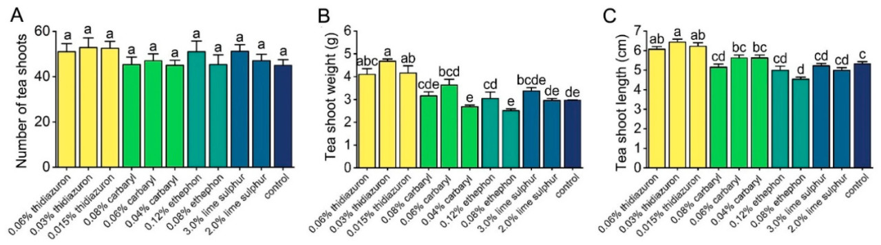 Рисунок 5. Влияние тидиазурона, карбарила, этрела и известковой серы на количество чайных побегов (A), а также на вес (B) и длину (C) чайных побегов. Разные буквы указывают на значительные различия между различными обработками (тест Тьюки HSD, p < 0,05). Данные представляют собой средние значения трех независимых делянок ± стандартной ошибки.