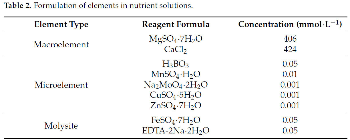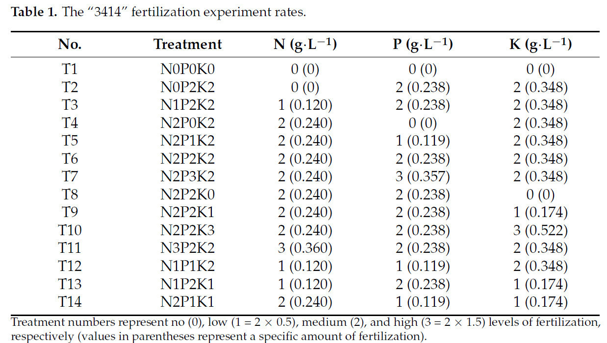 После обработки стрессом, на основе оптимальных концентраций элементов азота (N), фосфора (P) и калия (K) для роста конопли, полученных в предыдущих экспериментах, был приготовлен модифицированный питательный раствор Хогланда [28,29], содержащий 0,24 г·л⁻¹ N, 0,238 г·л⁻¹ P и 0,348 г·л⁻¹ K, и с использованием ортогонального экспериментального плана "3414" были установлены обработки с различными соотношениями N, P и K (Таблица 1). Эксперимент включал три фактора (N, P и K), каждый с четырьмя уровнями: 0 (без удобрения), 1 (50% от оптимального уровня удобрения), 2 (оптимальный уровень удобрения) и 3 (150% от оптимального уровня удобрения). Оптимальный уровень удобрения определялся как уровень внесения N, P и K, который максимизировал биомассу растений в предварительном эксперименте и служил основой для определения различных уровней удобрения в основном эксперименте. Среди этих 14 групп обработок обработки T2, T3, T6 и T11 представляли четыре уровня удобрения N; T4, T5, T6 и T7 представляли четыре уровня удобрения P; и T8, T9, T6 и T10 представляли четыре уровня удобрения K. Концентрации N, P и K контролировались путем регулирования количеств NH₄NO₃, NaH₂PO₄ и K₂SO₄ в питательном растворе (другие компоненты питательного раствора показаны в Таблице 2). Каждая обработка имела три повторности, всего 42 горшка. Питательный раствор меняли каждые 3 дня, всего семь обработок (21 день). Рост и физиологические показатели измеряли в конце обработки.