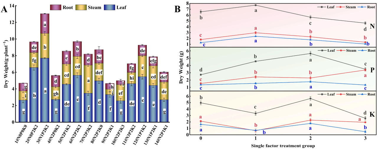 Рисунок 1. Влияние азота (N), фосфора (P) и калия (K) на биомассу конопли в условиях стресса NaHCO₃. (A) Четырнадцать наборов соотношений NPK (#1–#14); (B) Единичный фактор удобрений N, P и K. Разные строчные буквы указывают на значительные различия между обработками для одного и того же органа растения при p < 0,05.