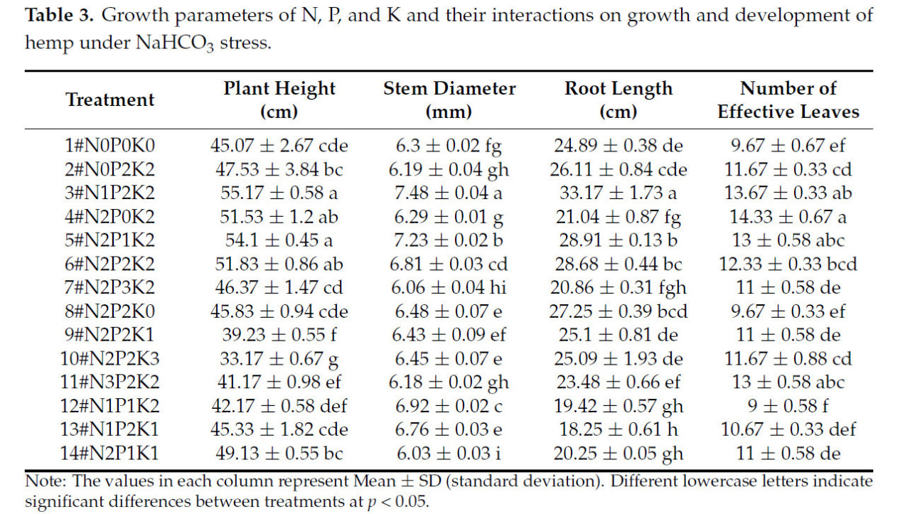 Наши результаты выявляют критические пороги внесения NPK для конопли в условиях щелочного стресса и предлагают практические стратегии удобрения для устойчивого возделывания конопли в засоленно-щелочных регионах.