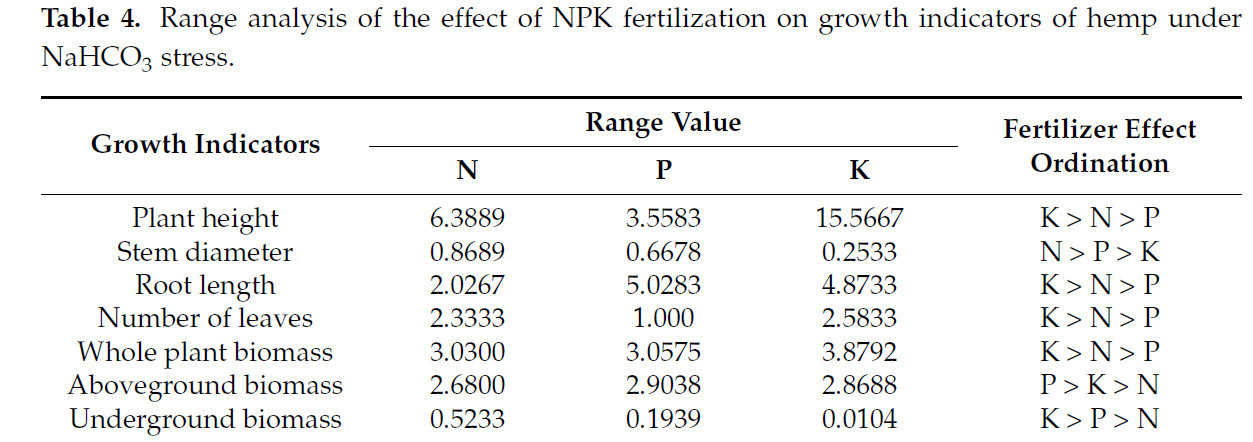 Метод анализа крайних разностей использовали для анализа эффектов различных способов удобрения на показатели роста конопли в условиях щелочного солевого стресса (Таблица 4). Результаты показали, что N оказал наибольшее влияние на толщину стебля, P оказал наибольшее влияние на сухой вес надземной части, а K оказал наибольшее влияние на высоту растения, длину корня, количество листьев, сухой вес подземной части и общий сухой вес растения.