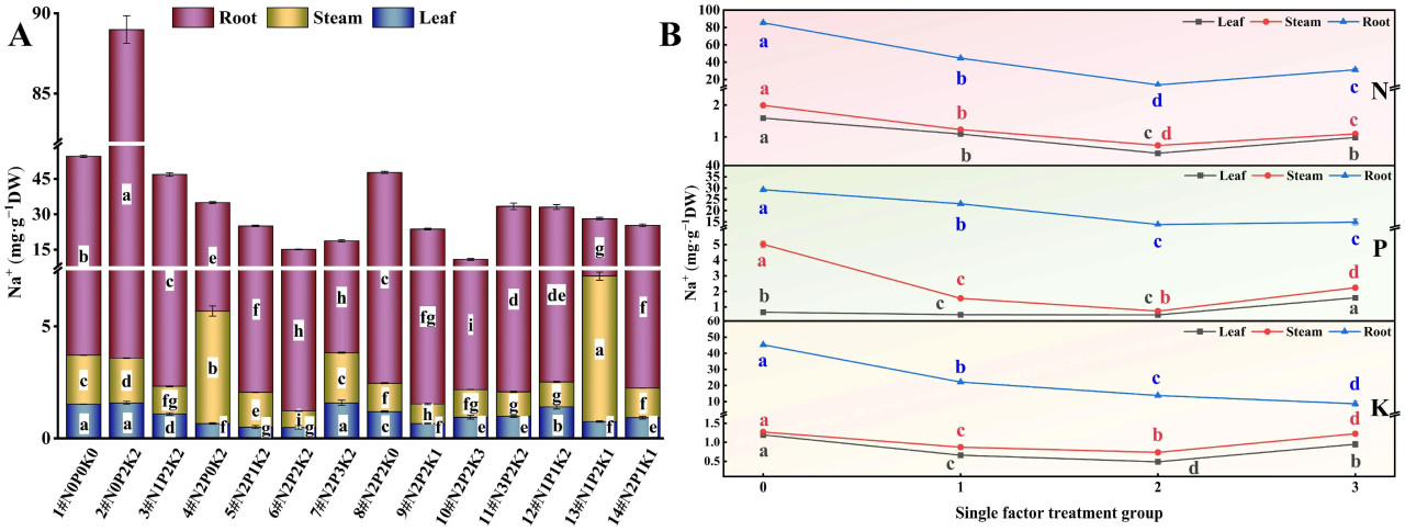 Рисунок 2. Влияние внесения N, P и K на содержание Na⁺ в конопле в условиях стресса NaHCO₃. (A) Четырнадцать наборов соотношений NPK (#1–#14); (B) Единичный фактор удобрений N, P и K. Разные строчные буквы указывают на значительные различия между обработками для одного и того же органа растения при p < 0,05.