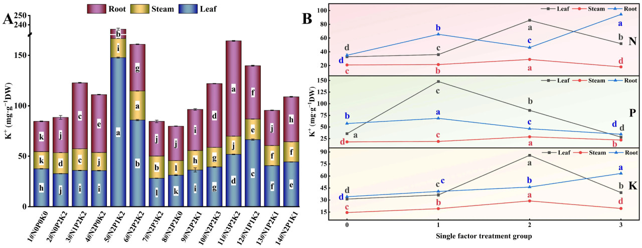 Рисунок 3. Влияние внесения N, P и K на содержание K⁺ в конопле в условиях стресса NaHCO₃. (A) Четырнадцать наборов соотношений NPK (#1–#14); (B) Единичный фактор удобрений N, P и K. Разные строчные буквы указывают на значительные различия между обработками для одного и того же органа растения при p < 0,05.