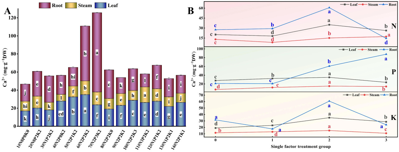 Рисунок 6. Влияние внесения N, P и K на содержание Ca²⁺ в конопле в условиях стресса NaHCO₃. (A) Четырнадцать наборов соотношений NPK (#1–#14); (B) Единичный фактор удобрений N, P и K. Разные строчные буквы указывают на значительные различия между обработками для одного и того же органа растения при p < 0,05.