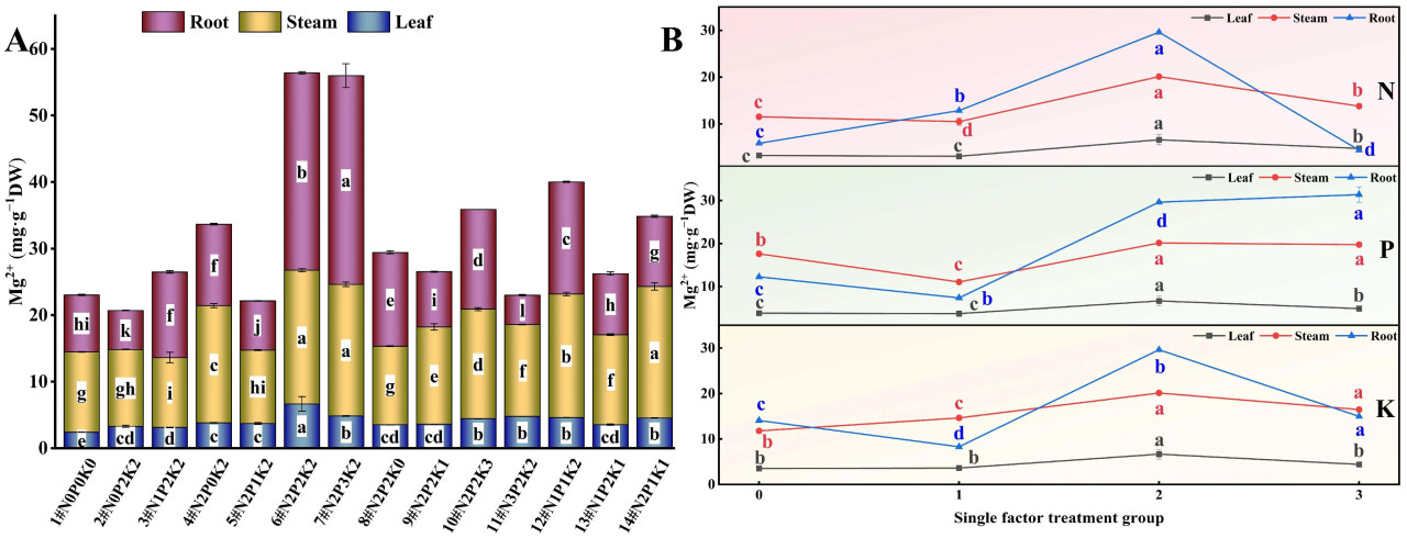 Рисунок 7. Влияние внесения N, P и K на содержание Mg²⁺ в конопле в условиях стресса NaHCO₃. (A) Четырнадцать наборов соотношений NPK (#1–#14); (B) Единичный фактор удобрений N, P и K. Разные строчные буквы указывают на значительные различия между обработками для одного и того же органа растения при p < 0,05.
