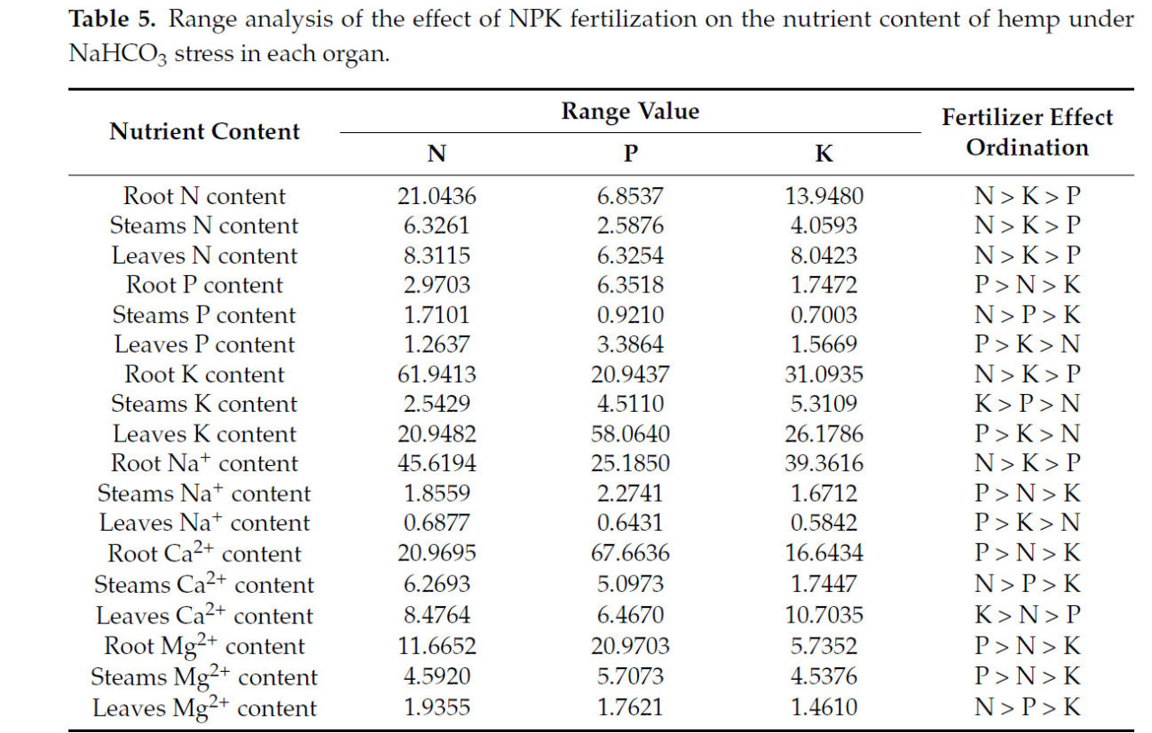 Анализ крайних разностей (Таблица 5) способов удобрения выявил значительные эффекты на элементы питания в конопле в условиях щелочного солевого стресса. Элемент N оказал наиболее значительное влияние на N, P и Ca²⁺ в стеблях; N, K и Na⁺ в корнях; и N и Mg²⁺ в листьях. Элемент P в основном влиял на P, Ca²⁺ и Mg²⁺ в корнях; Na⁺, P и K⁺ в листьях; и Na⁺ и Mg²⁺ в стеблях. Элемент K в основном влиял на K⁺ в стеблях и Ca²⁺ в листьях.