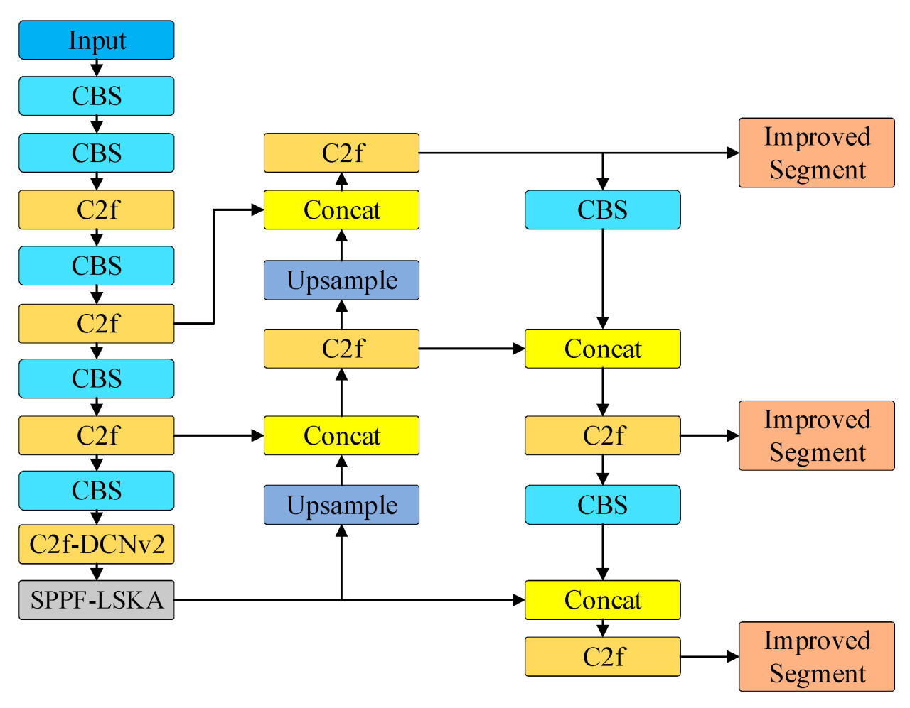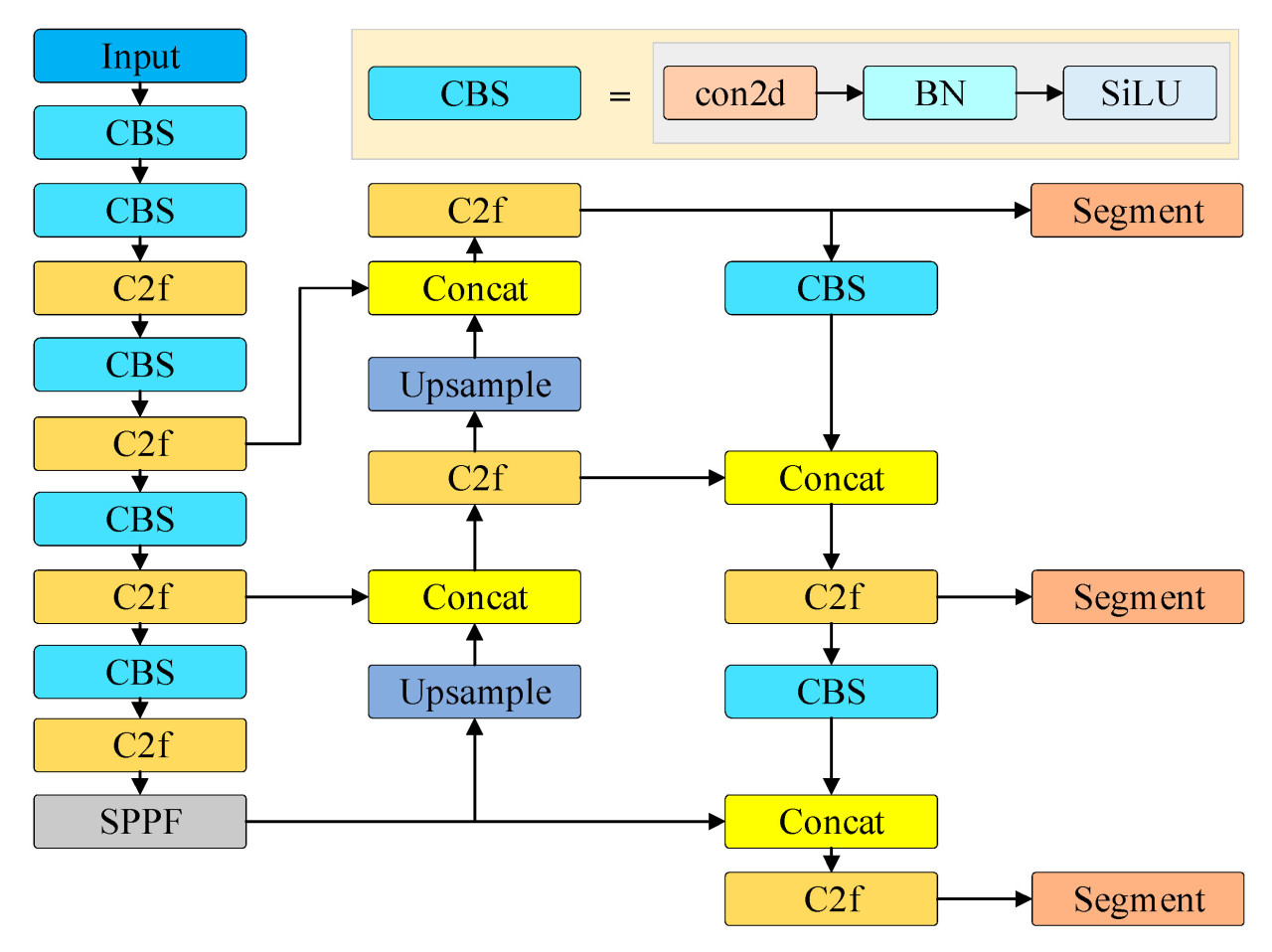 Сетевая структура YOLOv8-seg состоит из входного, основного (backbone), шеи (neck) и головного (head) модулей, как проиллюстрировано на Рисунке 3. Основной модуль состоит из модуля CBS, модуля C2f и модуля SPPF. Размер ядра первого сверточного слоя был изменен с исходного 6 × 6 на 3 × 3 на основе сети YOLOv5. Более того, все модули C3 были заменены модулями C2f, что привело к дальнейшему повышению вычислительной эффективности. Модуль шеи используется для слияния признаков на картах признаков, сгенерированных основной сетью. В головном компоненте используется развязанная структура, где несколько параллельных ветвей используются для извлечения признаков категории, позиционных признаков и признаков маски соответственно.