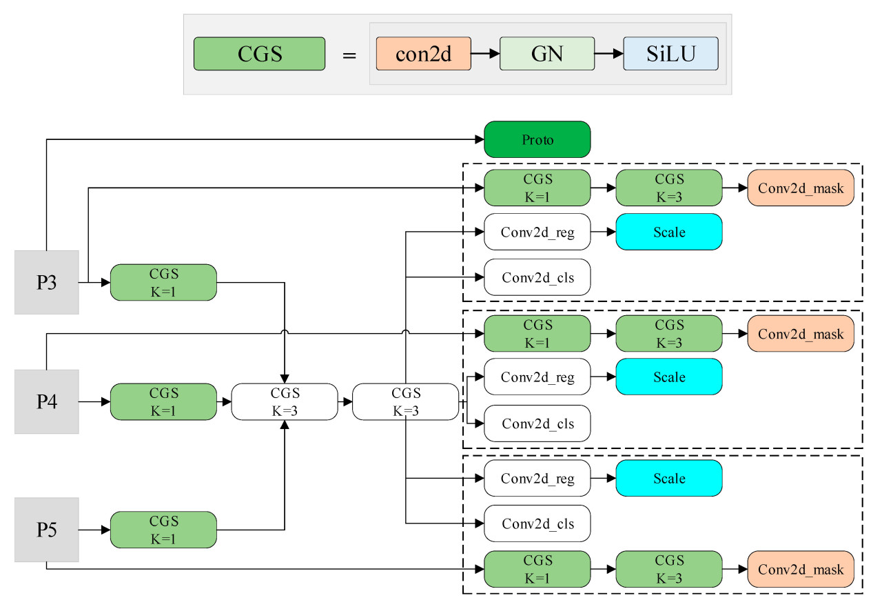 Оригинальная структура головки YOLOv8-seg, как показано на Рисунке 5, содержит большое количество параметров, что приводит к высоким вычислительным затратам. В этом исследовании модель была облегчена путем введения общей свертки и свертки 1 × 1 для уменьшения объема вычислений. Улучшенная структура головки YOLOv8-seg показана на Рисунке 6, где все белые модули используют общие свертки, включая модули CGS и модули Conv2d для классификации и регрессии. В ветвях регрессии и классификации выходные карты признаков компонента шеи сначала подвергаются сверточным операциям с использованием общих сверточных блоков 1 × 1 (CGS), а затем последующей обработке через два общих сверточных блока 3 × 3 (CGS) для классификации и обнаружения. Результаты регрессии ограничивающей рамки разных масштабов масштабируются с использованием масштабного коэффициента после вычисления регрессии, чтобы решить проблему несоответствия масштабов целей, обнаруженных разными ветвями регрессии, из-за общей свертки. Задача сегментации выполняется на уровне пикселей с акцентом на вычисление более уточненных пространственных признаков. Чтобы обеспечить точность сегментации, эта ветвь воздерживается от использования общих сверток. Модуль групповой нормализации (Group Normalization, GN), предложенный Ву и др., продемонстрировал улучшение точности вычислений в задачах обнаружения и сегментации по сравнению с пакетной нормализацией (Batch Normalization, BN) [34]. Использование общей свертки неизбежно приводит к некоторой степени снижения точности. Поэтому в этом исследовании групповая нормализация (GN) была использована в качестве замены пакетной нормализации (BN) внутри CBS, что привело к формированию модуля CGS для повышения точности окончательного вычисления. Более того, вычислительная нагрузка модели может быть дополнительно снижена за счет свертки 1 × 1.
