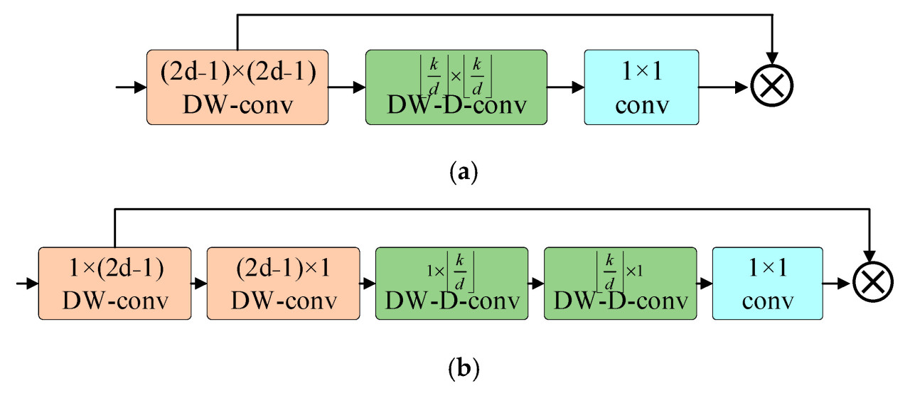 Рисунок 7. Структура модуля LKA и модуля LSKA: (a) модуль LKA; (b) модуль LSKA.