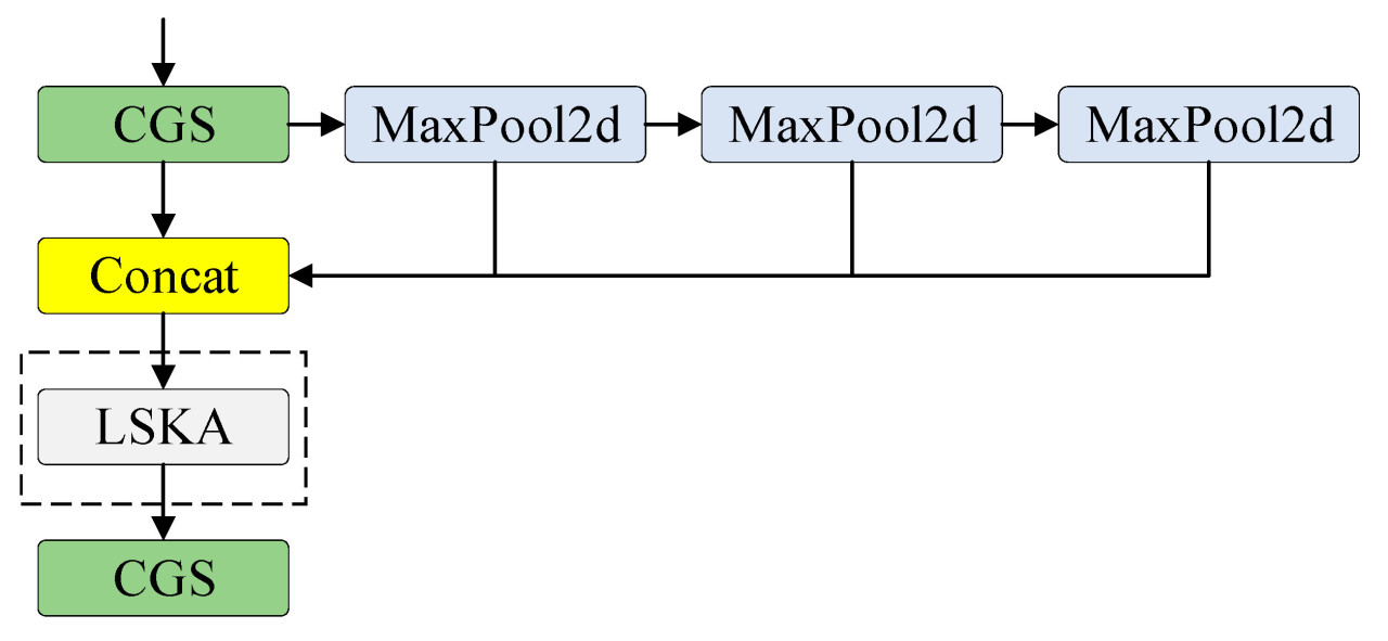 Модуль LSKA был включен после слоя Concat модуля SPPF в этом исследовании. Более того, слой BN был заменен слоем GN в модуле CBS для создания модуля CGS. Модуль SPPF-LSKA был сформирован посредством этих вышеупомянутых улучшений. Улучшенная структура показана на Рисунке 8. Способность к слиянию признаков модуля SPPF может быть улучшена с помощью этих улучшений, уменьшая влияние признаков фона на обнаружение чайных почек и зоны срыва и повышая точность модели в сложных условиях.
