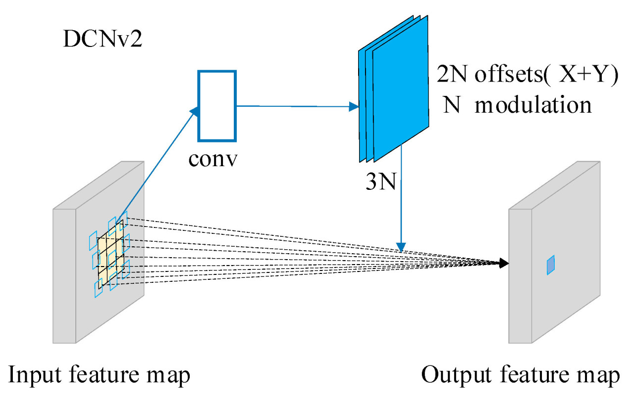 Традиционная свертка хорошо справляется с обработкой статических или регулярных целей; однако она может столкнуться с трудностями при работе с нерегулярными и изменчивыми формами чайных почек, а также значительными различиями в размере. По сравнению с традиционными сверточными сетями, деформируемая сверточная сеть (deformable convolution network, DCN) демонстрирует лучшие возможности распознавания для разнообразных форм и размеров чайных почек за счет динамической адаптации пространственных и структурных характеристик цели. Деформируемая сверточная сеть версии 1 (DCNv1) вводит обучаемые смещения для адаптации к деформации объектов на изображении; однако новое положение точки выборки после смещения может выйти за пределы идеального диапазона смещения. Чтобы устранить это ограничение, в DCNv2 каждая выборка не только изучает смещение, как в DCNv1, но и модулирует его с использованием изученных параметров модуляции. Если конкретно, DCNv2 вводит скаляр модуляции Δ𝑚𝑘 в процесс свертки, который представляет изменение амплитуды признака на k-й позиции. Это позволяет сети уделять приоритетное внимание ключевым признакам, уменьшать помехи от нерелевантной информации и, как следствие, повышать производительность модели. Структура DCNv2 показана на Рисунке 9.
