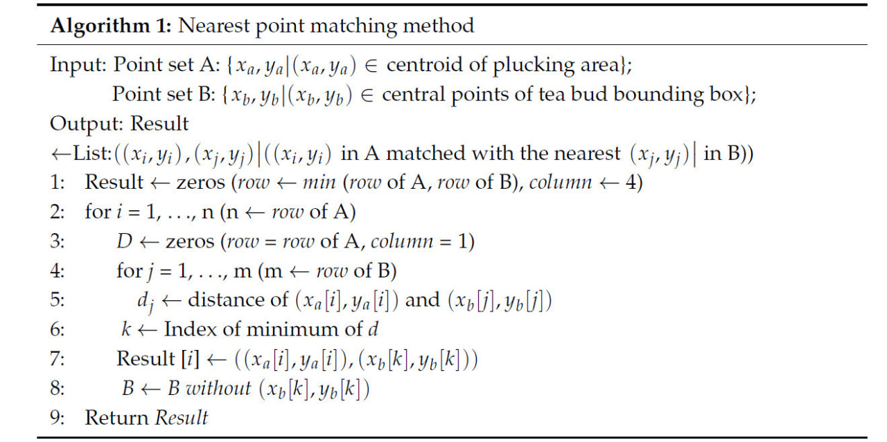 Метод сопоставления ближайшей точки (nearest point matching method, NPM) был предложен для реализации сопоставления точки срыва и чайной почки в этом исследовании. Два набора точек были получены с помощью вышеуказанных вычислений. Набор точек A представлял собой набор точек срыва чайной почки. Набор точек B представлял собой набор центральных точек ограничивающих рамок чайных почек. Как показано на Рисунке 12, синие точки принадлежат набору точек A, а красные точки принадлежат набору точек B. Согласно анализу на наборе данных изображений чая, точка срыва чайной почки ближе к центральной точке своей ограничивающей рамки, чем к ограничивающей рамке другой чайной почки. Поэтому основная идея метода сопоставления ближайшей точки заключается в том, чтобы сопоставить каждый член набора точек A с ближайшим членом набора точек B. Более подробные процедуры для метода сопоставления ближайшей точки можно увидеть в Алгоритме 1.