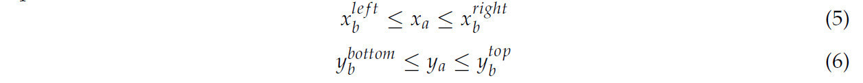 Вообще говоря, центроид зоны срыва расположен внутри ограничивающей рамки чайной почки, потому что зона срыва является частью чайной почки. Поэтому метод сопоставления точки в диапазоне (point in range matching method, PIRM) может быть использован для сопоставления точки срыва с центральной точкой ограничивающей рамки чайной почки. Как показано на Рисунке 3, координата ширины x точки срыва была расположена между левой и правой границами чайной почки. Аналогично, координата высоты y точки срыва была расположена между верхней и нижней границами чайной почки. Основная идея PIRM заключается в поиске того, какая ограничивающая рамка чайной почки удовлетворяет условиям уравнений (5) и (6).