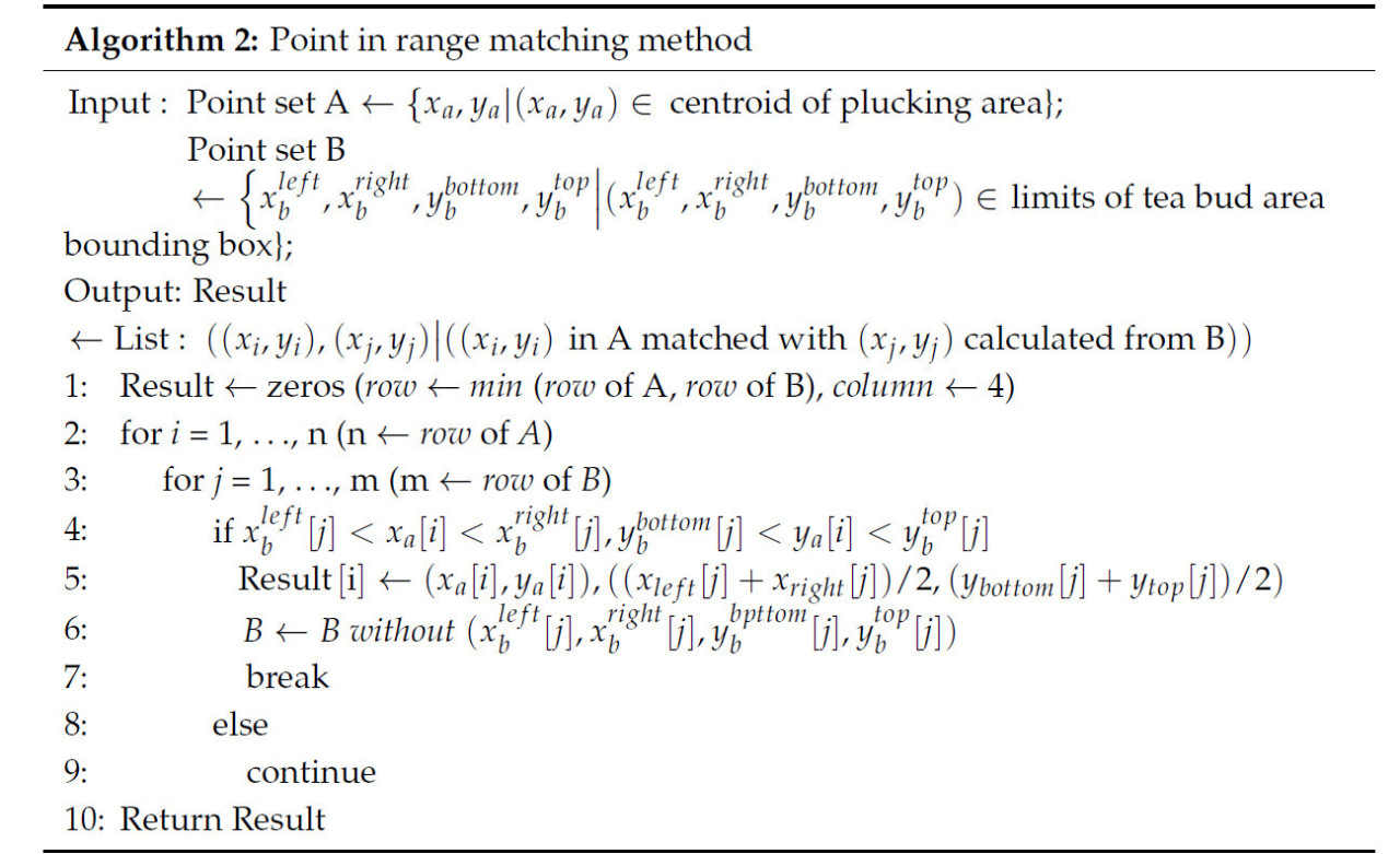 После сегментации экземпляров чайных изображений были получены маска чайной почки и маска зоны срыва. Но каждая маска чайной почки и маска зоны срыва, полученные от сегментации экземпляров, были одиночными масками; они не были связаны друг с другом. Точка срыва и поза чайной почки — это то, что мы хотели получить в деятельности по сбору чая. Чтобы получить эту информацию, сначала необходимо сопоставить зону срыва и чайную почку на одном чайном растении. Точное сопоставление зоны срыва и чайной почки является ключевым предварительным условием для получения оптимальной позы срыва. Повышение точности сопоставления не только улучшает общую эффективность сопоставления, но и существенно способствует точным расчетам позы срыва чайной почки. Более того, это способствует фактическому высокоточному механизированному сбору чайных почек. Были предложены два алгоритма для выполнения сопоставления, включая метод сопоставления ближайшей точки и метод сопоставления точки в диапазоне.