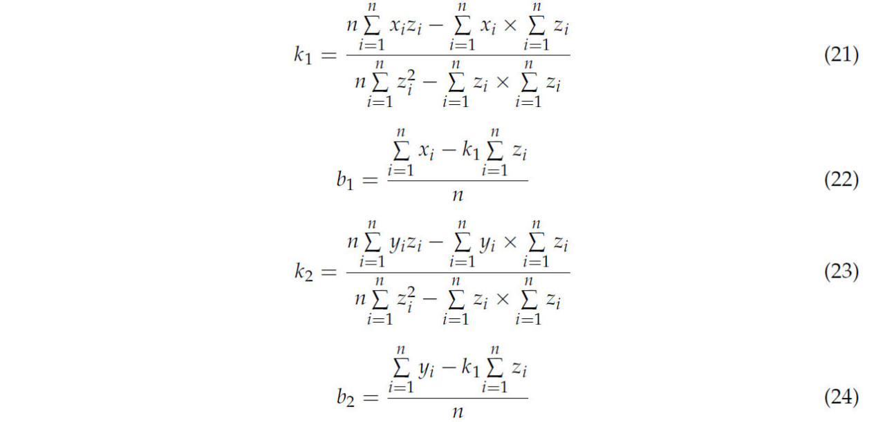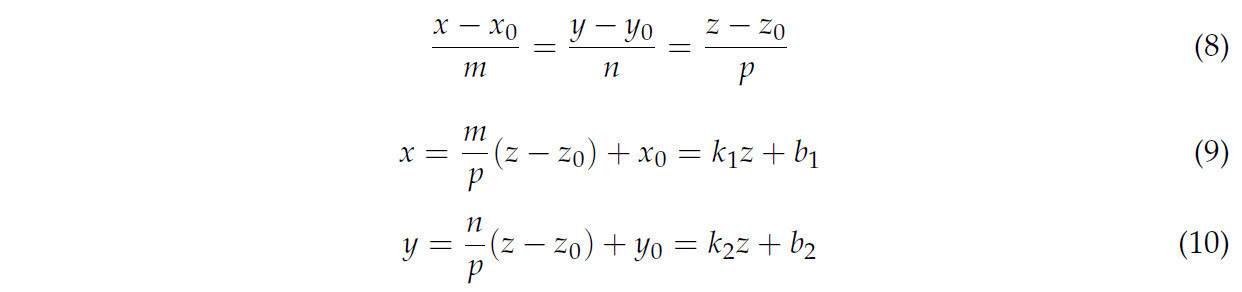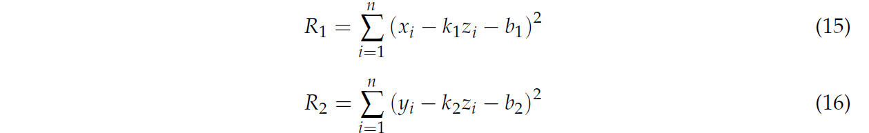 Следовательно, пространственную линию можно рассматривать как пересечение двух плоскостей в уравнениях (9) и (10). Метод наименьших квадратов был использован для аппроксимации пространственной линии, и когда сначала был завершен остаточный анализ, сумма квадратов остатков была рассчитана, как в уравнениях (15) и (16).