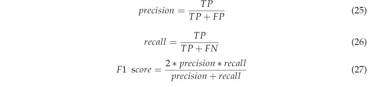 Оценка обнаружения и сегментации в основном проводилась путем оценки результатов использования сети YOLO в этом исследовании. Точность (precision), полнота (recall), оценка F1 и GFLOPs были включены в метрики оценки. Точность, рассчитываемая по формуле (25), представляет собой отношение фактически истинных выборок ко всем выборкам, предсказанным как истинные, что представляет точность предсказания истинных выборок. Полнота — это отношение выборок, предсказанных как истинные, в фактически истинных выборках, что может быть рассчитано по формуле (26). Оценка F1, рассчитываемая по формуле (27), является балансирующим показателем точности и полноты.
