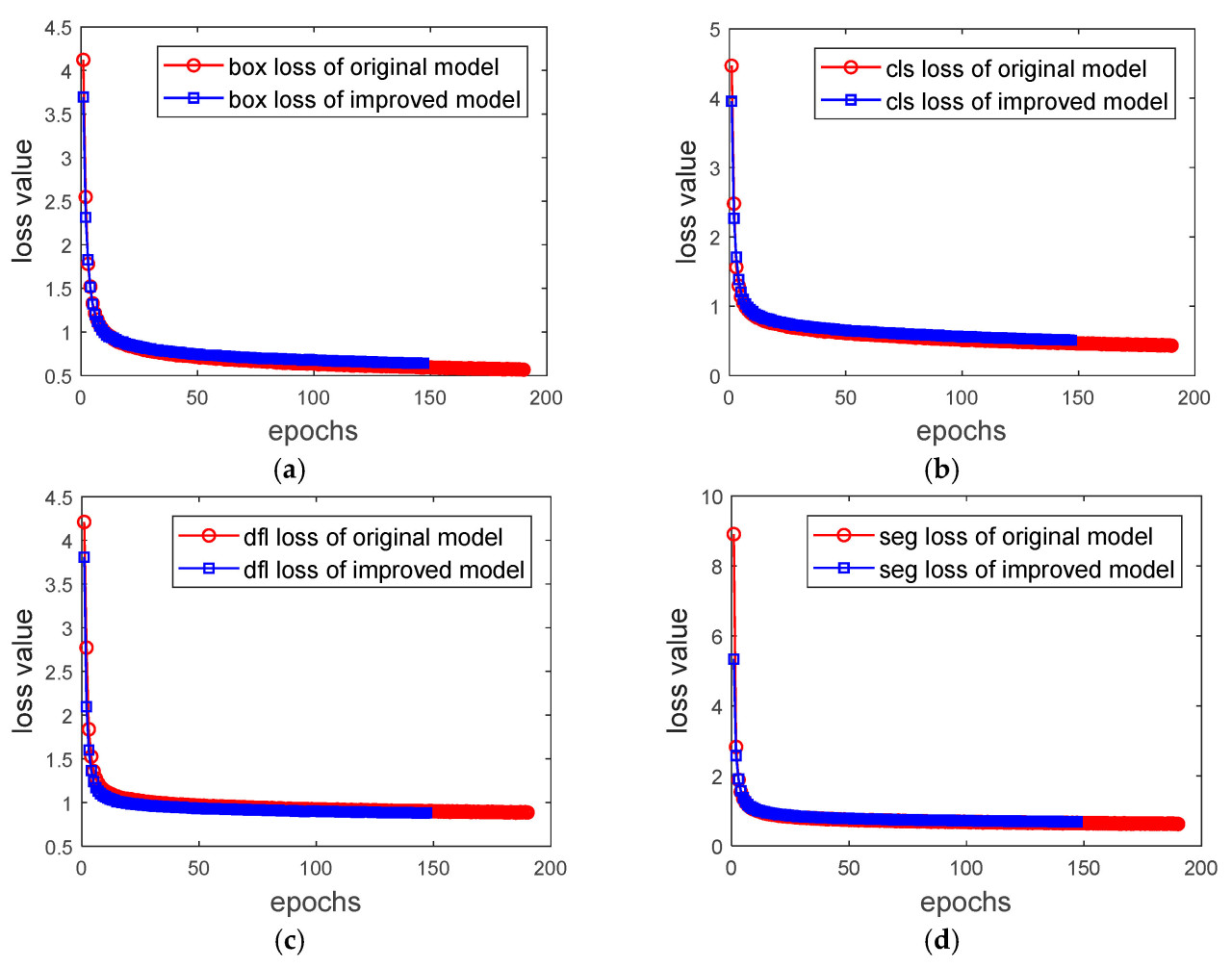 Рисунок 16. Кривые изменения значения потерь для оригинальных и улучшенных моделей: (a) потери ограничивающей рамки; (b) потери классификации; (c) фокальные потери распределения; (d) потери сегментации.