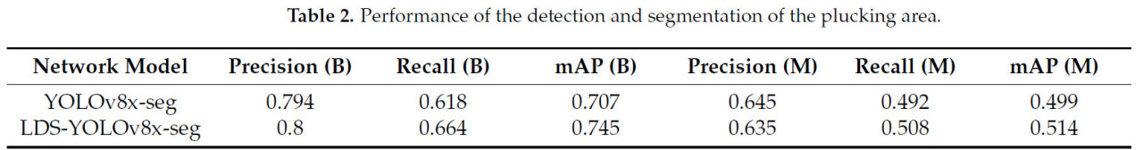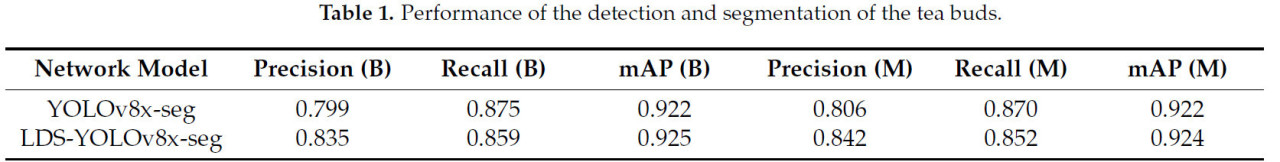 (1) Улучшенная модель YOLOv8-seg была предложена для обнаружения и сегментации экземпляров чайных почек и их зоны срыва, направленная на автоматический сбор чайных почек. Включая улучшенные модули головки, SPPF-LSKA и C2f-DCNv2, модель LDS-YOLOv8-seg продемонстрировала превосходящую производительность в обнаружении и сегментации чайных почек и зоны срыва со значениями точности обнаружения, полноты и mAP, равными 0,818, 0,761 и 0,835, а также значениями точности сегментации, полноты и mAP, равными 0,739, 0,68 и 0,719. Более того, вычислительная стоимость уменьшилась на 12,77% по сравнению с оригинальной моделью.