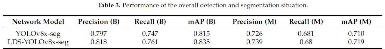 Таблица 1, Таблица 2, Таблица 3 представляют результаты обнаружения объектов и сегментации экземпляров, полученные с использованием моделей YOLOv8x-seg и LDS-YOLOv8x-seg для чайных почек, зоны срыва и общей ситуации соответственно. Как показано в Таблице 1, точность (precision) и mAP модели LDS-YOLOv8x-seg превзошли таковые у модели YOLOv8x-seg с точки зрения обнаружения чайных почек. Как видно из Таблицы 2, точность, полнота (recall) и mAP модели LDS-YOLOv8x-seg все превзошли таковые у модели YOLOv8x-seg с точки зрения обнаружения зоны срыва. С комплексной точки зрения, как показано в Таблице 3, точность, полнота и mAP обнаружения объектов, достигнутые с использованием модели LDS-YOLOv8x-seg, превзошли таковые у модели YOLOv8x-seg. В отношении сегментации экземпляров чайных почек, как показано в Таблице 1, как точность, так и mAP модели LDS-YOLOv8x-seg превзошли таковые у модели YOLOv8x-seg, с увеличением точности на 3,6%. Что касается сегментации экземпляров зоны срыва, как видно из Таблицы 2, точность модели LDS-YOLOv8x-seg была немного ниже, чем у оригинальной модели YOLOv8x-seg; однако как полнота, так и mAP претерпели значительные улучшения. Комплексно, как показано в Таблице 3, с точки зрения сегментации экземпляров, модель LDS-YOLOv8x-seg проявила заметные улучшения как в точности, так и в mAP, сохраняя при этом практически неизменную полноту по сравнению с оригинальной YOLOv8x-seg. Приведенные выше результаты демонстрируют, что улучшенная модель данной статьи показала превосходящую производительность в обнаружении и сегментации чайных почек и зоны срыва по сравнению с оригинальной моделью.