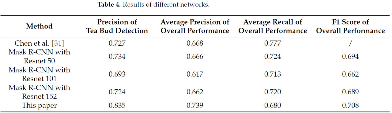 Был проведен сравнительный анализ алгоритма в соответствующем исследовании и типичной сегментации экземпляров Mask R-CNN. Чен и др. [31] достигли обнаружения и сегментации чайных почек с использованием комбинации моделей Faster-RCNN и FCN-16s. Они использовали двухэтапную сеть обнаружения целей Faster-RCNN для распознавания чайных почек, а затем применение обученной сети FCN-16s для выполнения точной сегментации чайных почек. Сеть Mask R-CNN с различными базовыми архитектурами (backbones) также была рассчитана в этом сравнении. Как представлено в Таблице 4, сравнивая эти методы с методом, представленным в этой статье, наблюдается, что точность обнаружения чайных почек, достигнутая с использованием нашего метода, заметно превосходит их.