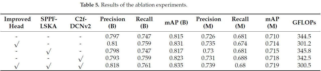 Чтобы исследовать влияние каждой стратегии улучшения, включая улучшенную головку, SPPF-LSKA и C2f-DCNv2, на улучшение производительности обнаружения объектов и сегментации экземпляров модели, в этом исследовании были проведены абляционные эксперименты с использованием проверочного набора данных. Результаты представлены в Таблице 5. Очевидно из таблицы, что по сравнению с оригинальной моделью YOLOv8-seg улучшенная модель демонстрирует значительно улучшенный эффект производительности. Анализ трех отдельных улучшений указывает, что сеть, включающая улучшенный модуль головки, показала превосходящую производительность как в задачах обнаружения объектов, так и в задачах сегментации экземпляров. В частности, при обнаружении объектов точность улучшилась на 1,3%, полнота увеличилась на 1,2%, а mAP улучшилась на 1,6% относительно оригинальной модели сети. С точки зрения сегментации экземпляров, как точность, так и mAP показали значительные улучшения, в то время как вычислительная стоимость модели была заметно снижена, достигнув уменьшения на 12,54% по сравнению с оригинальной YOLOv8-seg. Это дополнительно продемонстрировало существенное влияние улучшенного модуля головки на облегчение модели. Для улучшенной модели с модулем SPPF-LSKA можно видеть, что модуль имеет значительное улучшение в производительности обнаружения и сегментации экземпляров; все показатели в таблице были увеличены по сравнению с оригинальной моделью. Сеть, улучшенная с C2f-DCNv2, также показала превосходящую производительность как в сегментации экземпляров, так и в обнаружении объектов, с полнотой и mAP, увеличившимися на 1,2% и 0,8% соответственно при обнаружении, и всеми показателями, улучшившимися во время сегментации экземпляров.