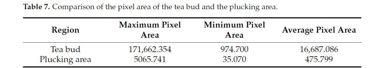 Случаи неудач были встречены в сегментации экземпляров и сопоставлении характерных точек. Сложность обнаружения малых целей является основной причиной неудачи идентификации чайной почки и зоны срыва. В дополнение, точность распознавания сетевой модели также подвержена влиянию большого различия между размером чайных почек и зоны срыва. Согласно статистике площадей пикселей чайных почек и зоны срыва на изображениях обучающего набора данных, использованного в этом исследовании, как показано в Таблице 7, существует большой разрыв между двумя видами площадей пикселей.