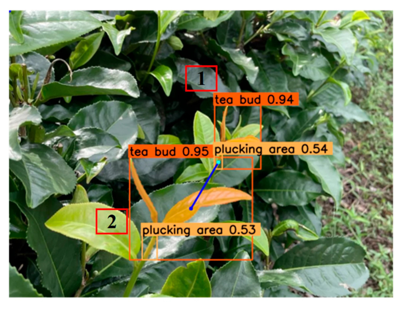 Анализ причин неудачи в процессе сопоставления характерных точек был основной работой в этом исследовании. В случаях неудач PIRM мы узнали, что основной причиной было то, что центроид зоны срыва и центральная точка ограничивающей рамки чайной почки располагались вместе или отдельно в ограничивающей рамке другой чайной почки. Как показано на Рисунке 19, точка срыва чайной почки №1 была расположена в ограничивающей рамке чайной почки №2 и была ближе к центральной точке ограничивающей рамки чайной почки №2. В случаях неудач NPM основной причиной было то, что точка срыва другого чайного растения действительно была ближе к центральной точке ограничивающей рамки этого чайного растения, чем ограничивающая рамка того чайного растения. Это можно видеть на Рисунке 20a, где точка срыва чайной почки №1 была ближе к центральной точке ограничивающей рамки чайной почки №2, чем к чайной почке №1.