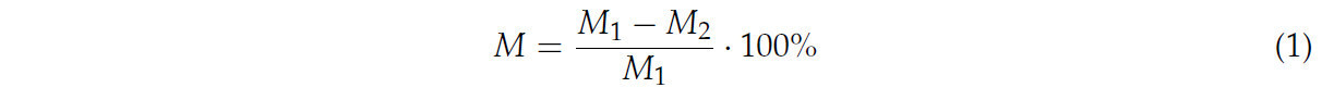 В уравнении, M представляет влажность стеблей волокнистой конопли (%), M1 представляет массу стеблей волокнистой конопли до сушки (г), а M2 — массу стеблей волокнистой конопли после сушки (г).