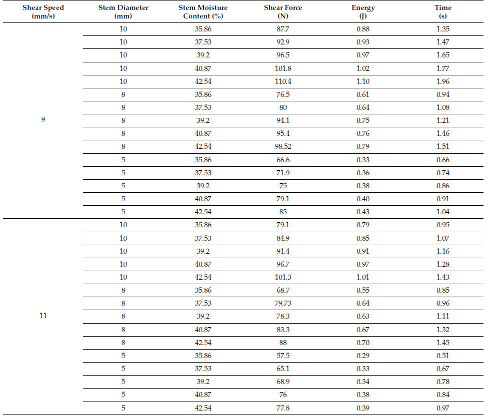 Результаты испытаний режущих механических свойств стеблей промышленной конопли волокнистого типа представлены в Таблице 1. Анализ сосредоточен на изменении потребляемой мощности среза, скорости среза, времени среза и силы среза в зависимости от диаметра стебля, а также взаимосвязи силы среза со скоростью среза, диаметром стебля и влажностью стебля [22,23,24,25].