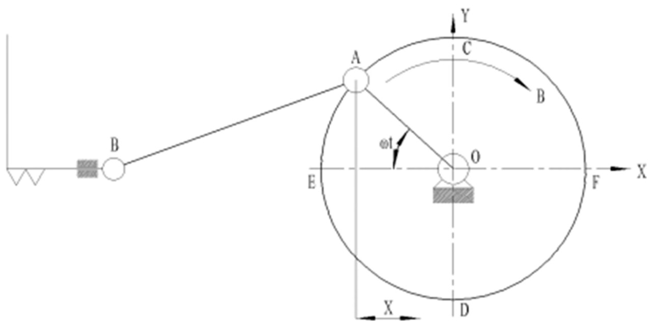 Режущий аппарат использует возвратно-поступательный резак, который характеризуется простой структурой, большой боковой рабочей шириной и малым продольным занимаемым пространством, что делает его подходящим для высокоскоростных операций резки в косилке-плющилке. Приводной механизм использует кривошипно-шатунный механизм, известный своей простой и компактной структурой, а также высокой эффективностью передачи. Анализ характеристик движения режущего аппарата напрямую влияет на режущую способность. Его режим движения — возвратно-поступательное боковое движение, характеризующееся прерывистостью. Поэтому, анализируя характеристики движения и определяя взаимосвязь между смещением и скоростью, предоставляется основа для определения взаимосвязи между скоростью среза и скоростью движения вперед. На Рисунке 3 иллюстрируется анализ движения режущего аппарата.