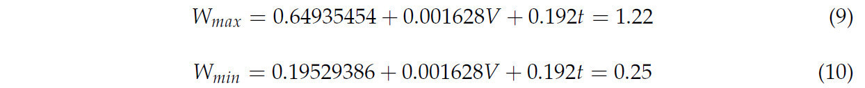В уравнении, W_max представляет максимальную потребляемую мощность (Дж), W_min представляет минимальную потребляемую мощность (Дж), V представляет скорость среза (м/с), а t — время среза (с).