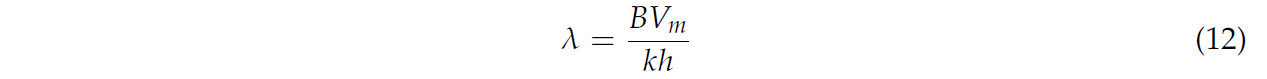 В уравнении, λ представляет коэффициент скорости конвейера, Vs представляет скорость конвейера (м/с), Vm представляет скорость среза (м/с), B представляет ширину среза (м), h представляет длину пальца конвейера (м), а k — коэффициент накопления стеблей.