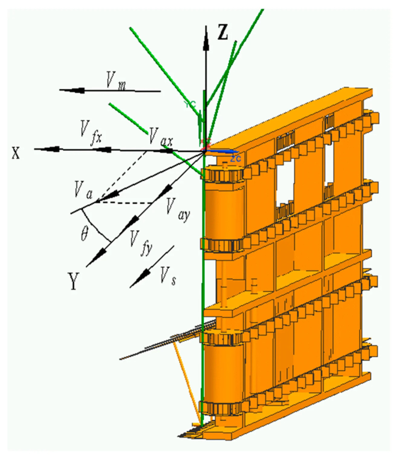 Процесс падения растения после его транспортировки к точке выгрузки является ключевым фактором, определяющим равномерность процесса укладки [29,30]. При анализе процесса падения одного растения, без учета связующей силы между соседними растениями, можно видеть, что когда растение все еще находится в вертикальном положении и вот-вот упадет, на него влияет скорость в направлении движения машины (Vm), скорость в направлении транспортировки конвейера (Vs), скорость направляющей растения в направлении транспортировки (Vfy) и скорость направляющей растения в направлении движения вперед (Vfx). Угол между скоростью конвейера (Vα) и направлением транспортировки составляет θ, как показано на Рисунке 6.