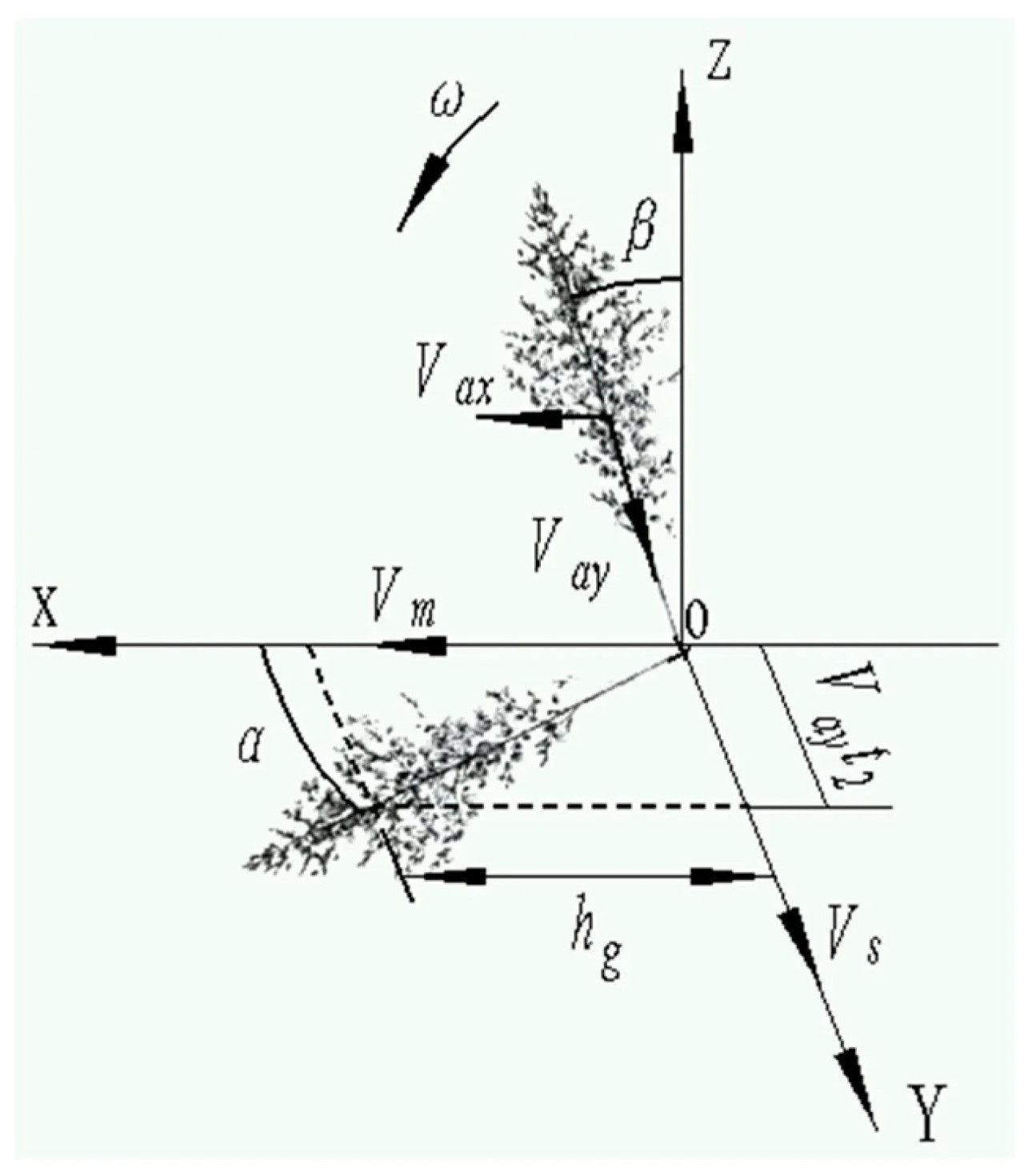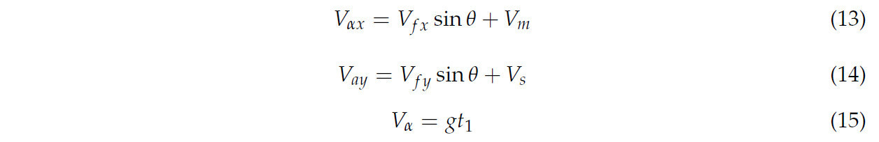 В уравнениях, Vax представляет составляющую скорости падения растения в направлении движения вперед (м/с), Vay представляет составляющую скорости падения растения в направлении конвейера (м/с), Va представляет фактическую скорость падения растения в направлении падения (м/с), g представляет ускорение свободного падения (м/с²), а t1 — время, за которое основание растения ударяется о землю во время процесса падения (с).