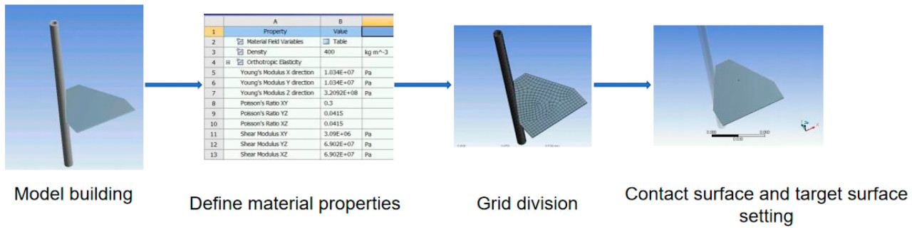 В этом разделе используется модуль Explicit Dynamics в Workbench 19.0 для проведения динамического анализа операции среза. Явная динамика может анализировать изменения напряжения в модели при воздействии нагрузки или скорости, что может охватывать большинство сценариев удара, резки и среза [31,32]. Этапы предварительной обработки для запуска симуляции с использованием программного обеспечения показаны на Рисунке 9. На Рисунке 10 показаны материальные свойства растений технической конопли.