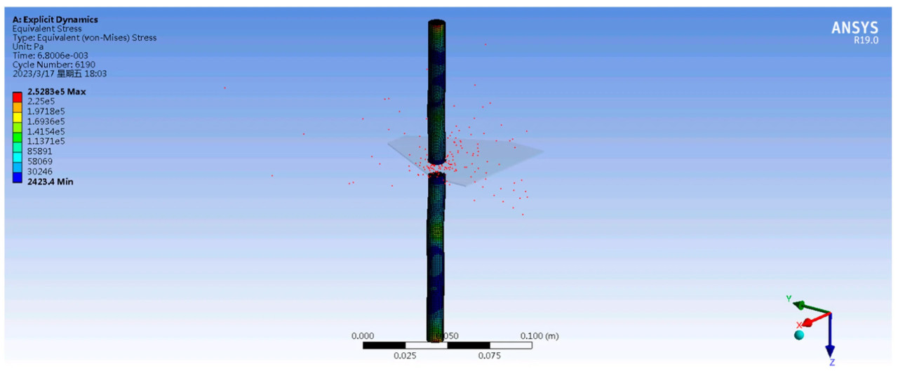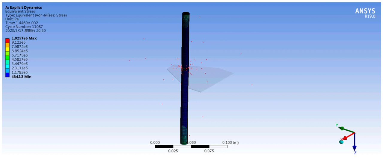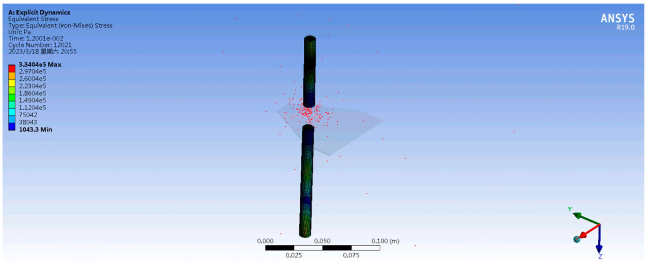 Разделение сетки имеет ключевое значение для точности симуляции. Растение, как гибкое тело, должно иметь плотность сетки 1 мм, в то время как лезвие, как режущее тело, должно быть определено как жесткое тело с меньшей плотностью сетки. Количество сгенерированных узлов составляет 17 854, а количество элементов — 12 097. Из предыдущего текста, среднее время среза одного растения при скоростях среза 1,9 м/с и 3,7 м/с составляет 0,0169 с и 0,0078 с соответственно, которые используются в качестве времени остановки симуляции.