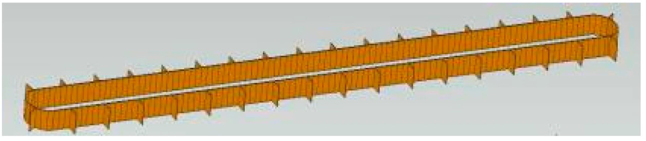 При моделировании процесса транспортировки растений конопли первым шагом является установление модели гибкости для конвейерной ленты. Программное обеспечение для имитационного моделирования, такое как ADAMS 2018, имеет модуль обработки гибкости, но он в основном используется для анализа жесткой деформации и собственных частот. По сравнению с предыдущими исследованиями, в данном исследовании предлагается разложить конвейерную ленту на небольшие сегменты, соединив их вращательными парами для имитации ее движения и достижения гибкого моделирования. Длина каждого сегмента установлена на 21 мм, и есть четыре типа: прямой край и изогнутый край, с пальцами или без них. Добавлены переходные блоки для обеспечения точной сборки. Собранная конвейерная лента состоит из различных сегментов. Чтобы предотвратить распознавание блоков с одинаковым именем в ADAMS как одного и того же компонента, имена заменяются после сборки. На Рисунке 14 показана модель собранной конвейерной ленты.
