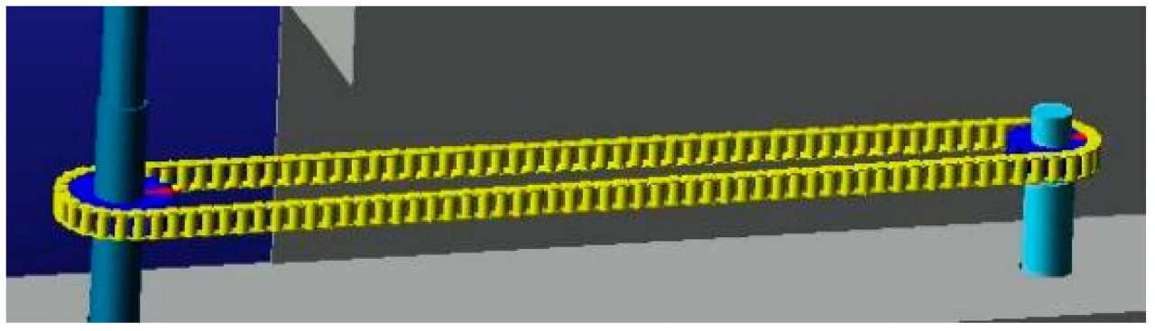 Далее, необходимо создать цепную приводную систему и применить ограничения модели. Косилка для волокнистой промышленной конопли имеет четыре конвейерные ленты, каждая из которых намотана вокруг приводного вала и ведомого вала при одинаковом диаметре вала и работает синхронно. Поэтому все четыре конвейерные ленты движутся с одинаковой скоростью. В этом исследовании анализируется только изменение скорости одной конвейерной ленты. В данной статье используется встроенный модуль ADAMS 2018 для создания полной цепной приводной системы, как показано на Рисунке 16.