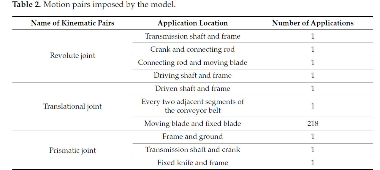 Основные типы кинематических пар, применяемых в модели, — это вращательные пары, поступательные пары и фиксированные пары, которые используются для имитации движения конвейерной ленты и режущего механизма, а также для фиксации всей машины. Конкретные местоположения и количества этих пар показаны в Таблице 2.