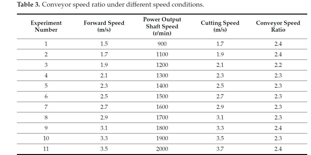 Во время работы уборочной машины необходимо обеспечить, чтобы объем подачи конвейерной ленты был не меньше объема среза. В противном случае на конвейере будет скапливаться слишком много растений, вызывая засорение, что в тяжелых случаях может повредить машину [27,28]. Объем подачи зависит от скорости конвейера (Vs), а объем среза зависит от скорости движения вперед (Vm). Поэтому в данном исследовании вводится коэффициент скорости конвейера (λ) для выражения скорости конвейера, как показано в уравнении (12).