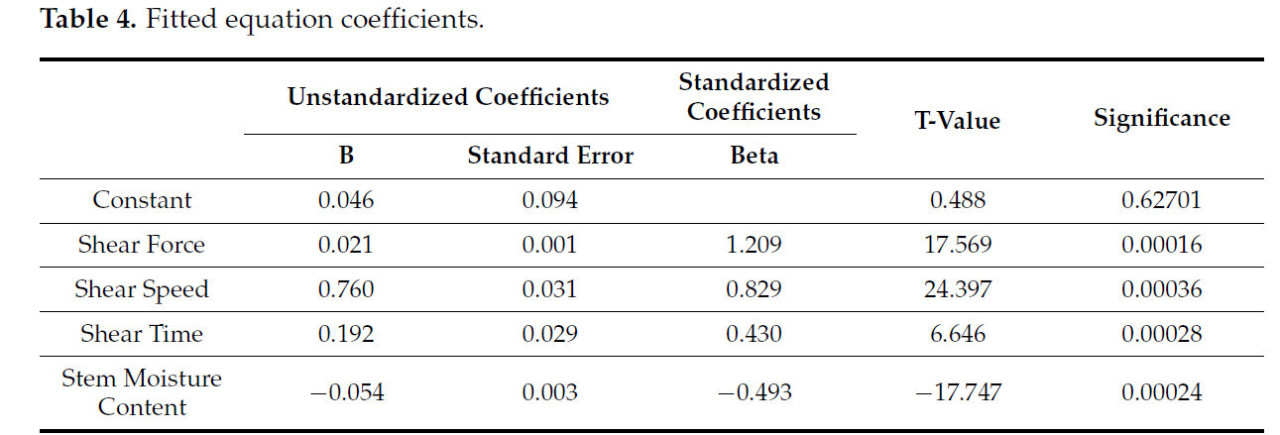 В уравнении, W представляет потребляемую мощность среза (Дж), X1 представляет скорость среза (м/с), X2 представляет диаметр стебля (мм), X3 представляет время среза (с), а X4 — влажность стебля (%).