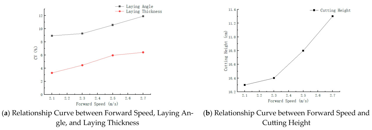 Анализ Рисунка 18 показывает, что скорость движения вперед оказывает значительное влияние на коэффициент вариации угла укладки и толщины укладки, а также на высоту среза. Это указывает на то, что скорость движения вперед сильно влияет на эксплуатационные характеристики машины. Когда скорость движения вперед составляет 2,7 м/с, коэффициенты вариации для угла укладки и толщины укладки, а также высота среза достигают своих максимальных значений, которые составляют 11,91%, 6,41% и 11,3 см соответственно. Поэтому диапазон скорости движения вперед установлен как 2,1–2,5 м/с.