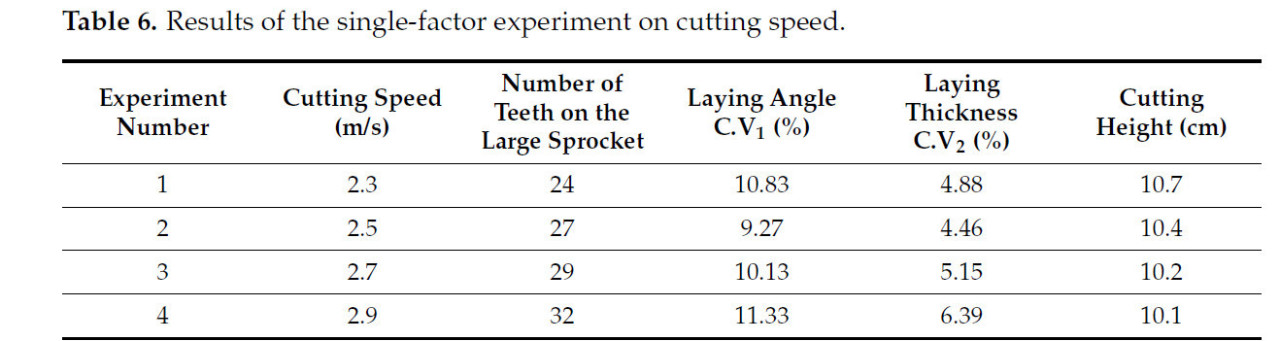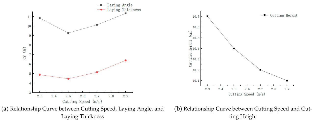 Анализ Рисунка 19 показывает, что коэффициент вариации для угла укладки и толщины уменьшается, а затем увеличивается с увеличением скорости среза. Минимальные значения возникают при 2,5 м/с (9,27%, 4,46%), а максимальные значения — при 2,9 м/с (11,33%, 6,39%). Высота среза уменьшается с увеличением скорости, с минимальным значением при 2,9 м/с, равным 10,1 см, и максимальным значением при 2,3 м/с, равным 10,7 см. Причины этого следующие: при низких скоростях резка затруднена, что влияет на равномерность укладки; с увеличением скорости эффект продвижения ослабевает, и равномерность улучшается. Однако при чрезмерно высоких скоростях повторный срез вызывает вариации угла, что негативно влияет на равномерность. При низких скоростях растения наклоняются вперед, что приводит к более высокой высоте среза. С увеличением скорости растения становятся более вертикальными, и высота среза уменьшается. Поэтому диапазон скорости среза установлен как 2,3–2,7 м/с.