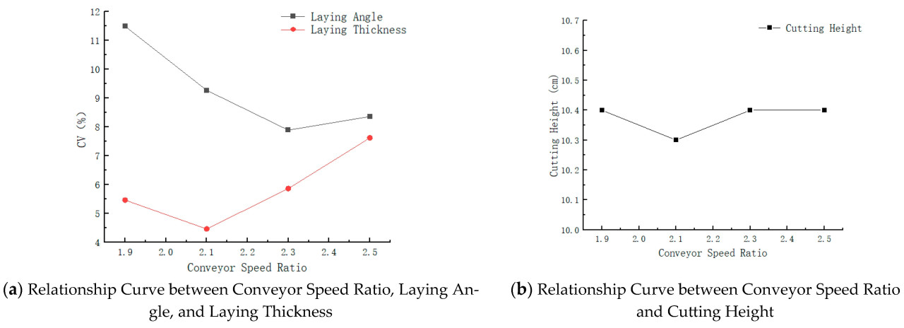 Анализ Рисунка 20 показывает, что коэффициент вариации для угла укладки и толщины уменьшается, а затем увеличивается с коэффициентом скорости конвейера. Минимальные значения возникают при коэффициентах скорости конвейера 2,1 и 1,9, в то время как максимальные значения — при 1,9 и 2,5. Высота среза показывает небольшую тенденцию колебаний с увеличением коэффициента скорости конвейера, с общим изменением между 10,3 см и 10,4 см. Коэффициент скорости конвейера влияет на состояние подачи растений, тем самым влияя на равномерность укладки, но оказывает минимальное влияние на высоту среза. Поэтому диапазон коэффициента скорости конвейера установлен как 2,1–2,5.